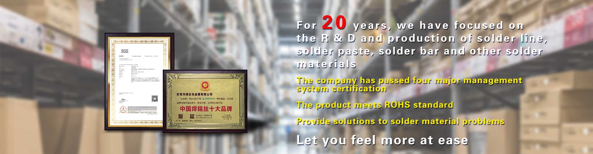 21 years of focus on solder research and development and production, using high quality tin ore raw materials, with advanced production equipment.