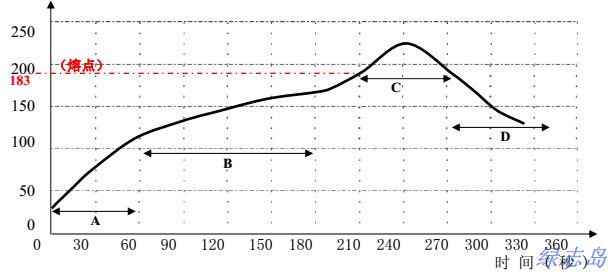 以下是綠志島焊錫廠建議的熱風回流焊工藝所采用的溫度曲線,可以用作回焊爐溫度設定之參考。該溫度曲線可有效減少焊錫膏的垂流性以及錫球的發(fā)生,對絕大多數(shù)的產(chǎn)品和工藝條件均適用。