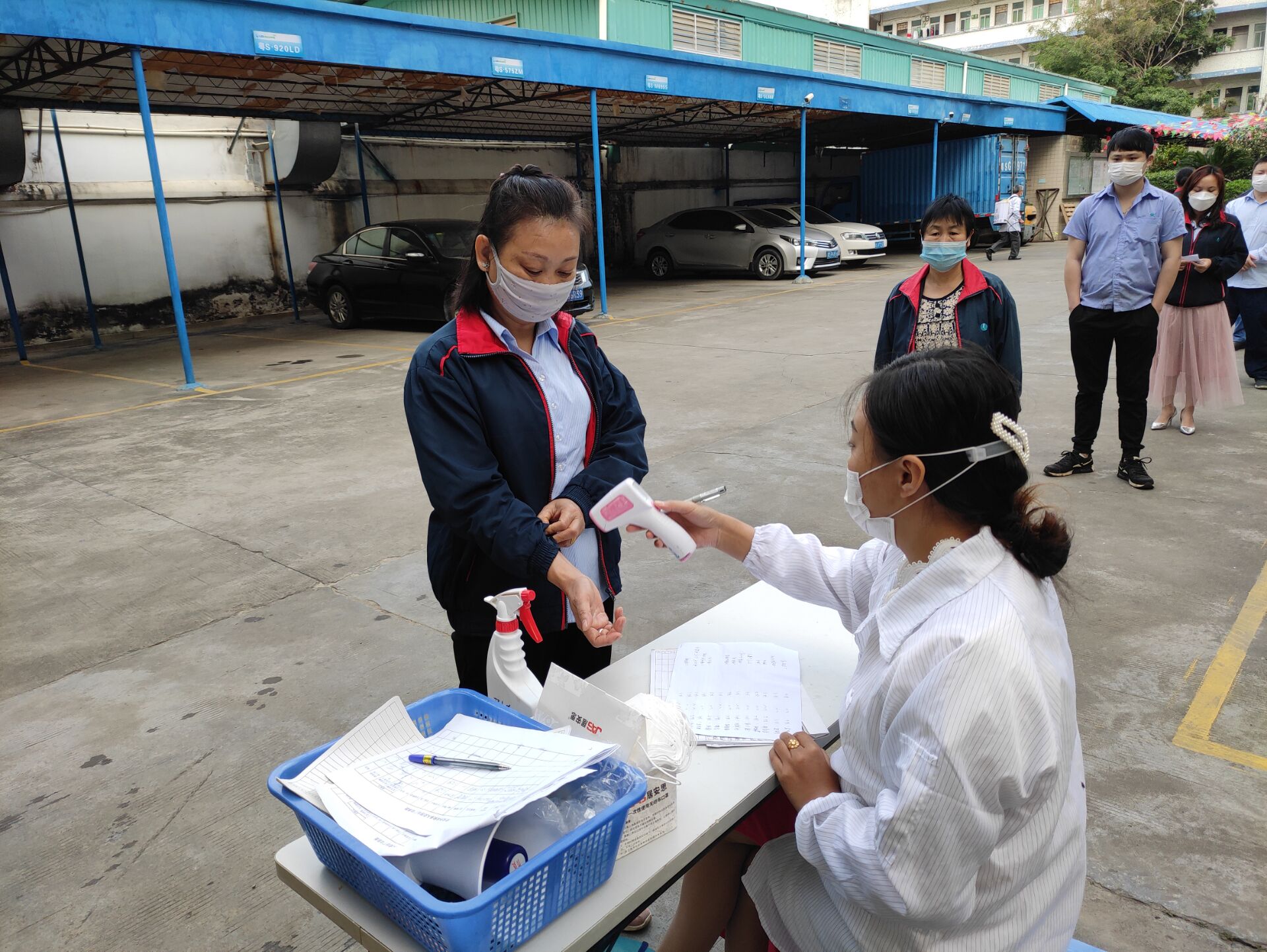 ▲每天早上盧經(jīng)理給每位上崗人員量測體溫